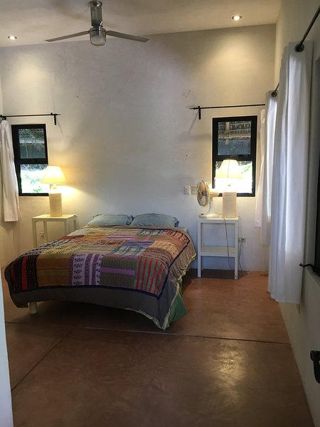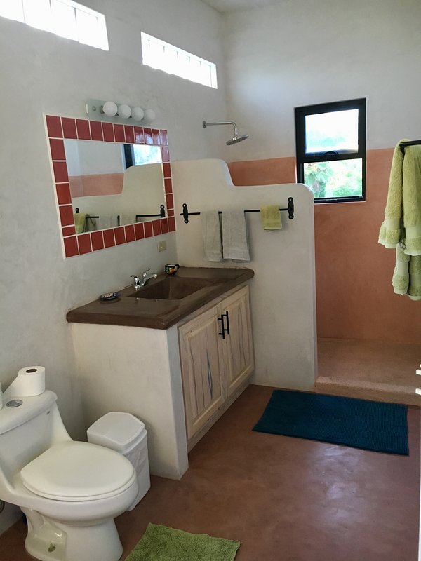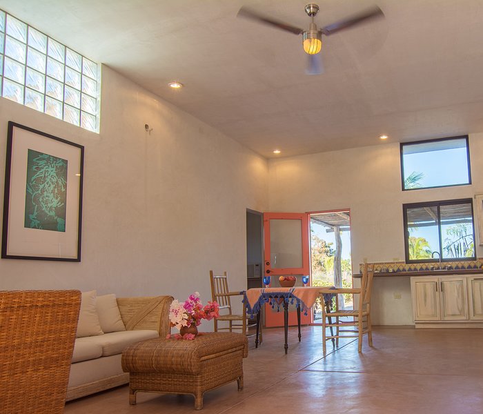 Casa Solana includes thoughtful touches such as high ceilings, large outdoor palapa-shaded sitting areas with ceiling fans, a well-stocked kitchen with modern appliances, solid-wood doors, plenty of windows to admit the sea breeze, ample closet space, high-quality sheets, spacious full bathrooms, parking, and an outdoor shower with heated water.